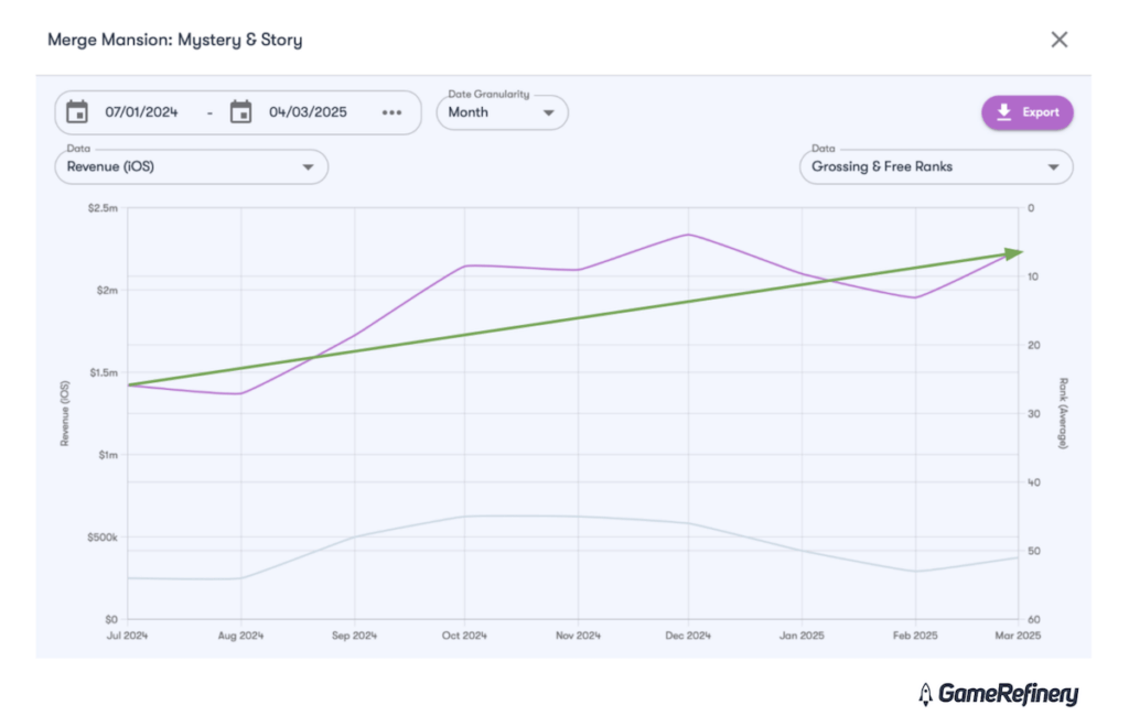 Merge Mansion is an incredibly popular merge-2 game where players combine items on a merge grid to complete tasks and restore an old family mansion. Since July 2024, Metacore has steadily increased Merge Mansion‘s ROI. Looking at the data on iOS for the US market, it’s clear that Metacore is doing something right. The game saw consistent growth in 2024.