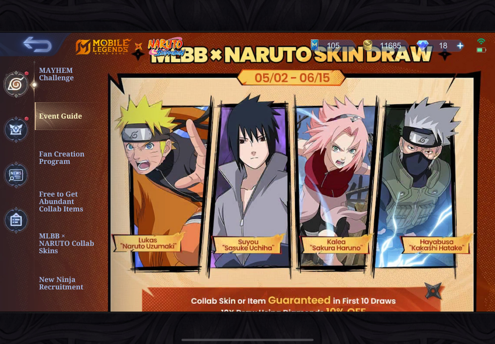 - Mobile Legends Bang Bang x Naruto: This collaboration introduced seven new Naruto-themed skins to the game, letting players enjoy their favorite anime characters in battle. Some of the featured skins are based on Naruto, Sasuke, Sakura, Kakashi, Gaara, Minato, and Sai, each matched with MLBB heroes. In addition to the Naruto skins, the game’s UI got a Naruto overhaul with Naruto-style recall animations, kill effects, and themed avatars.