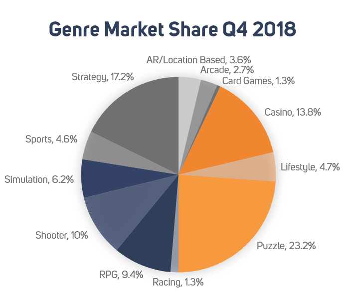 One of the key takeaways from the table earlier is that the US is still far behind Japan and China in terms of the overall popularity of mobile RPGs. This situation is well illustrated when looking at the genre composition of the US market during the past quarter: