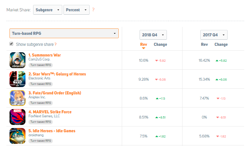 But how about the top-performing titles inside each RPG subgenre? And more specifically, what significant changes regarding RPGs took place in the market last year? The following table lists the top 5 biggest money-making machines inside each RPG subgenre, together with their revenue share-%s (iOS US) during Q4 2018 and Q4 2017.