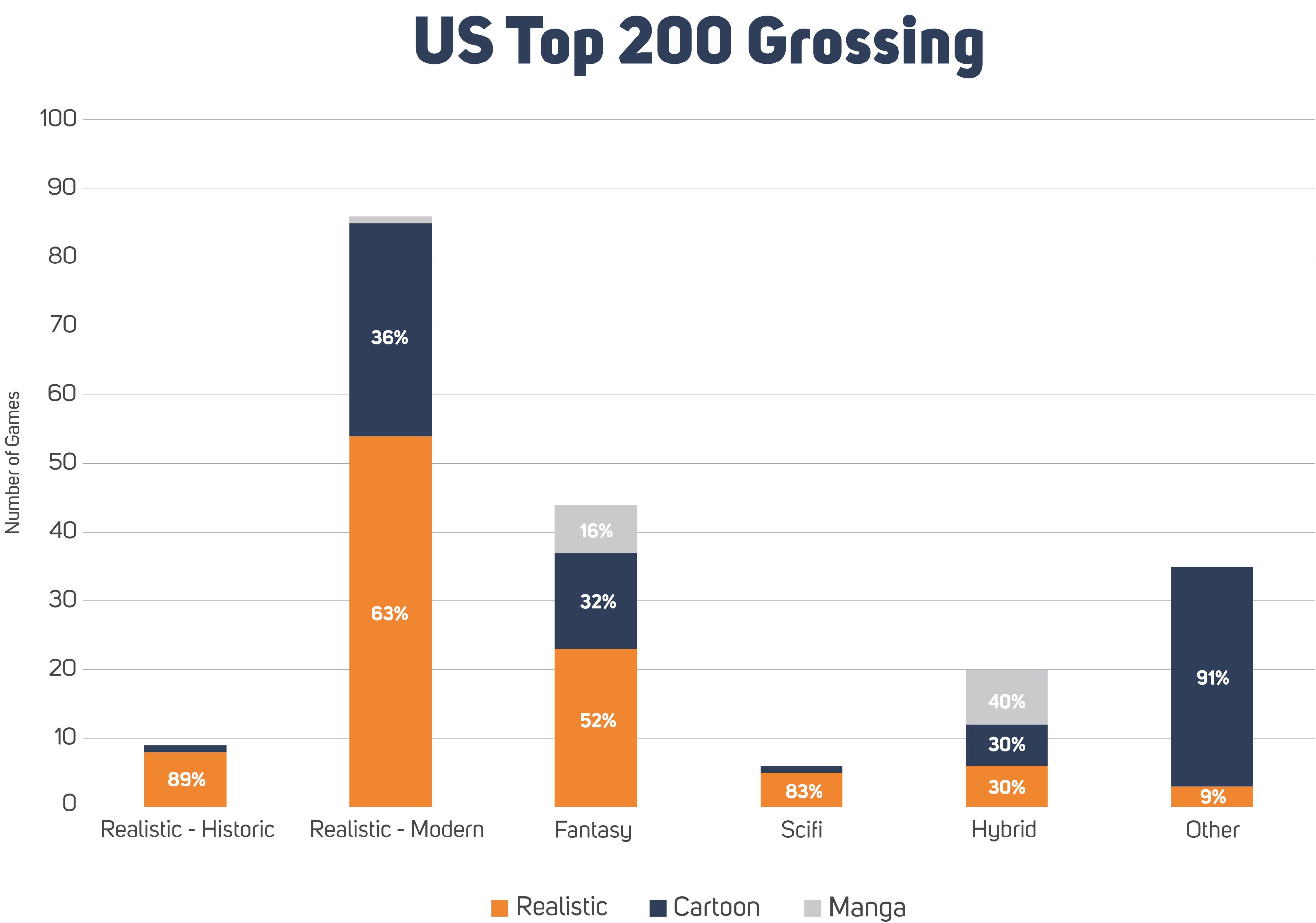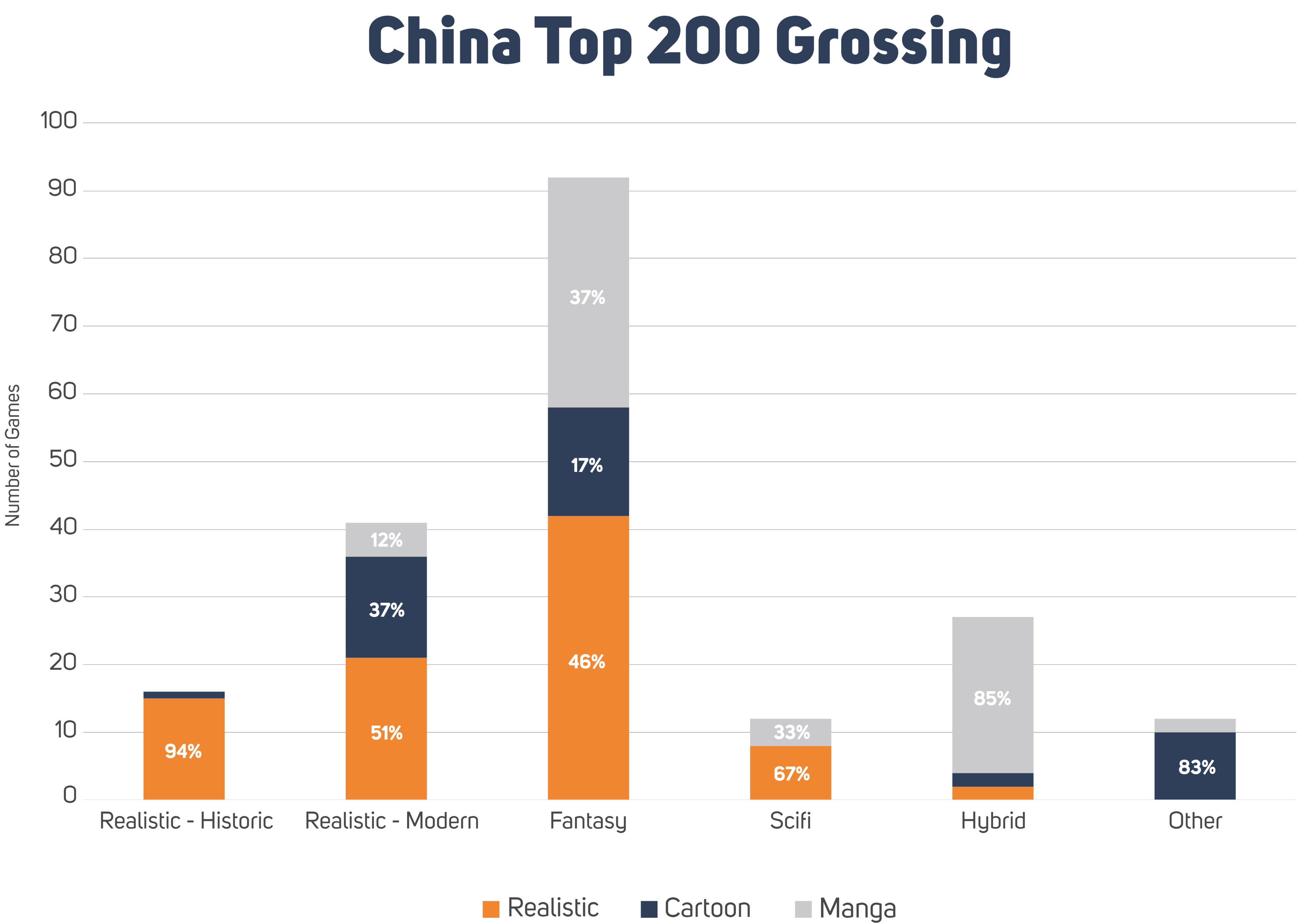 The US market is evenly split between Realistic and Cartoon game art styles, but Manga hasn’t been able to garner that much attention. The Chinese market is more equal in this regard, where the most significant share goes to Realistic with Manga and Cartoon following closely. In Japan, there’s one clear winner, Manga. It is the art style of choice in 62% of the top 200 games. The last 40% is pretty evenly shared by Realistic and “western” Cartoon styles.