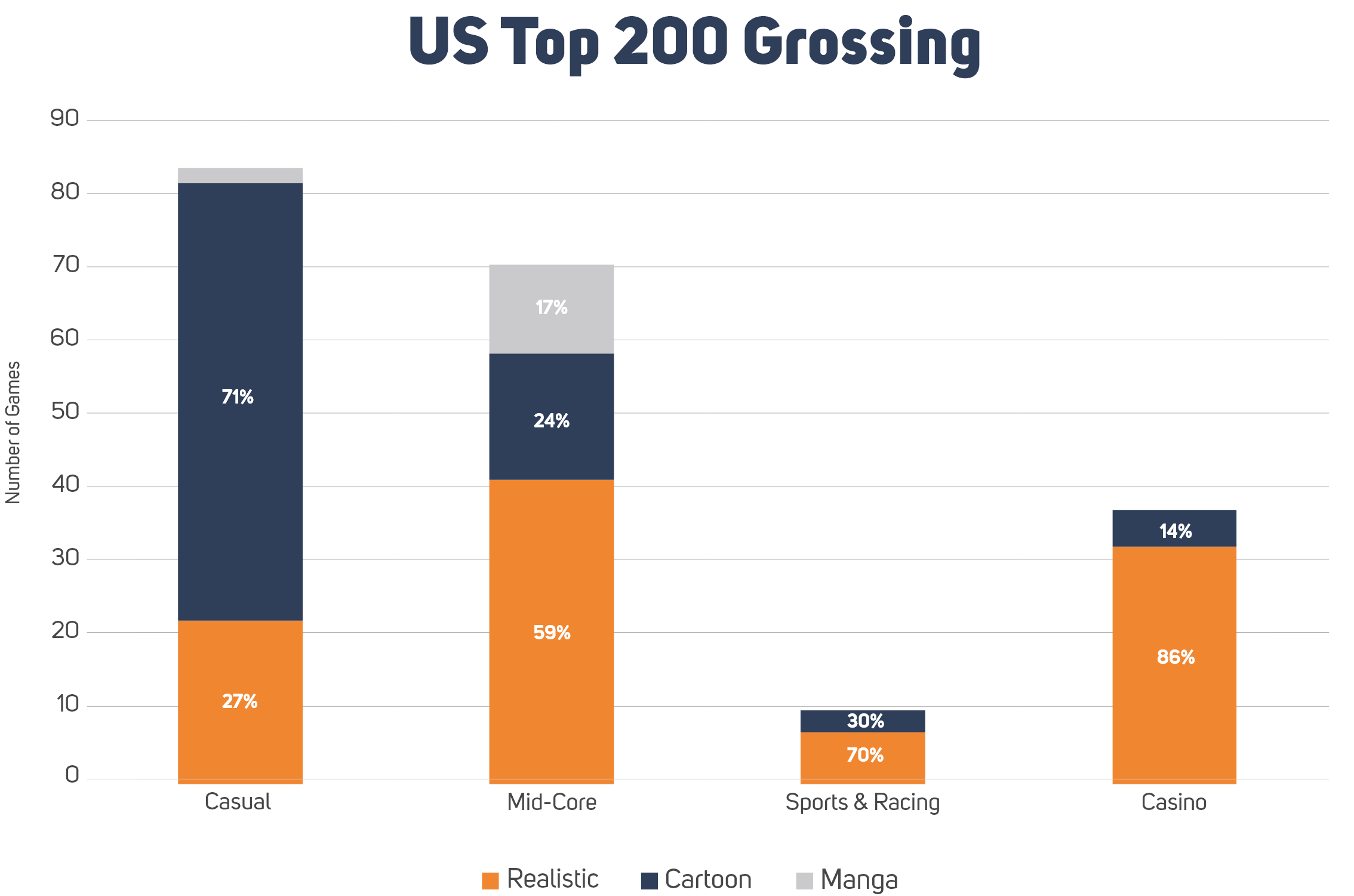 The Cartoon style dominates the US Casual market with over 71% share, whereas the Realistic style is the most popular in other categories.